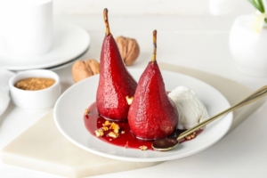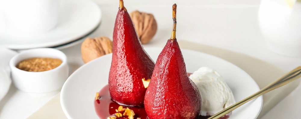 + Zu unseren Rotweinbirnen passen Nüsse, Sahne und ein Nuss- oder Vanilleeis.